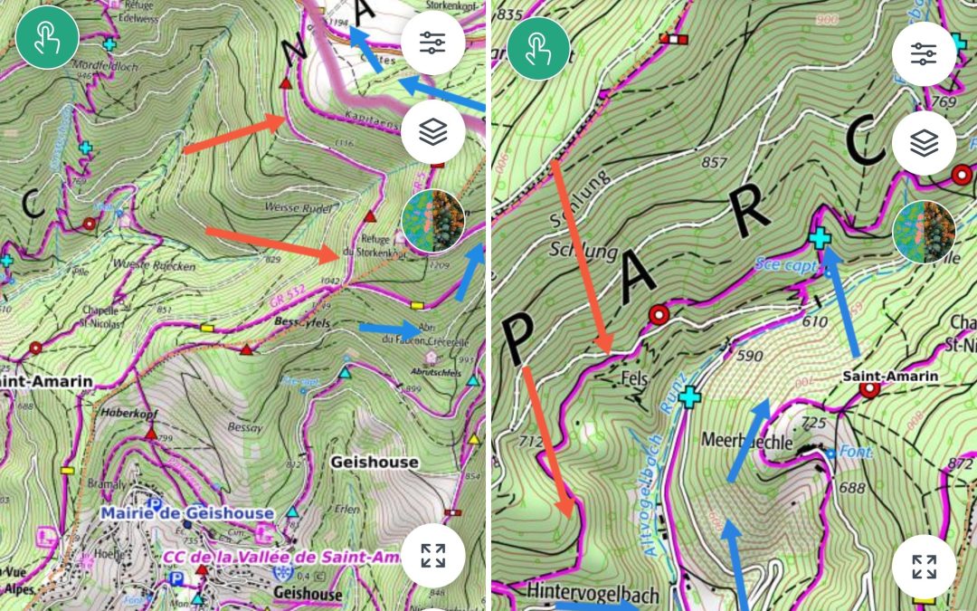 L itinéraire triangle rouge entre les 2 flèches orange. Il est fortement conseillé d utiliser la déviation indiquée par le fléchage bleu.tout le mois d’avril